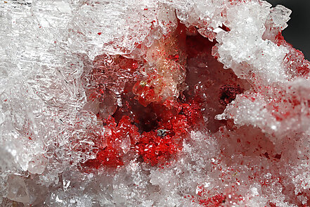 Cinnabar crystals with a dominant rhombohedral shape plus minor crystal forms, translucent, extraordinarily lustrous and with a very vivid color, on matrix with small crystals of Calcite, Quartz. The specimen has been carefully analyzed and determined to be Cinnabar and, although it was suggested that Metacinabar could be found in these specimens too, our analyses have not detected any. We will send a copy of the analysis to the buyer.