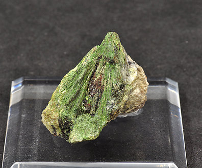 Elongated idiomorphic Brochantite crystals with very well defined faces and edges and deep color. On matrix, and partially covered by a later generation of fibrous crystals, of a lighter color and with a satiny luster.